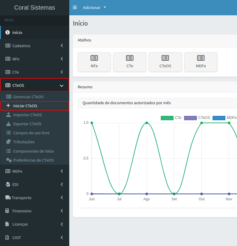 Partindo da tela inicial do sistema, a emissão do CTeOS é muito simples. Veja abaixo o passo a passo: