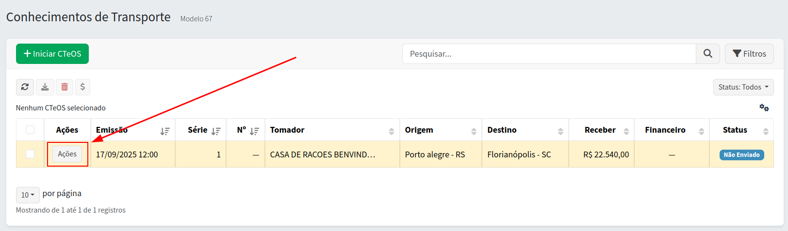 Passo 6. Então depois de salvo, o CTeOS vai aparecer na lista de CTeOS. Nesta lista ele vai aparecer com o status "Não Enviado". Isso significa que ele ainda não foi enviado para a SEFAZ (Secretária da Fazenda).
