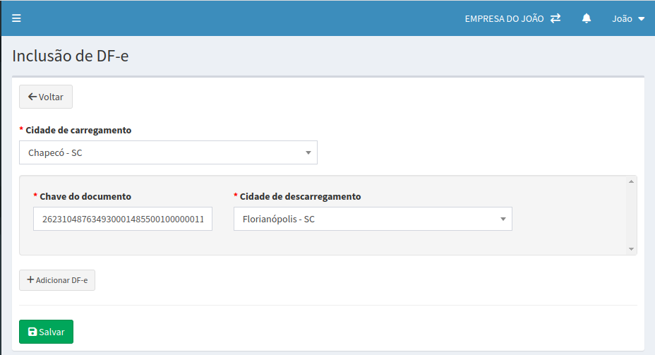 Na tela que abrir inclui-se a cidade de carregamento e a chave da nota e a cidade de descarregamento. Se tiver mais notas para incluir no mesmo carregamento, clica em Adicionar DF-e, se for só uma nota pode clicar em Salvar e em seguida clique na opção Enviar.