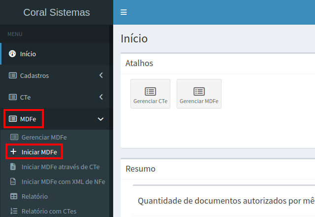 No menu lateral clique em MDFe depois em Iniciar MDFe, conforme mostra a imagem abaixo.