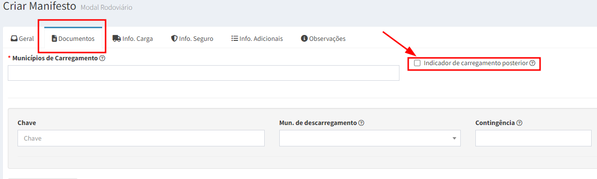 Na aba de Documentos deverá marcar somente a opção "Indicador de Carregamento Posterior" conforme imagem abaixo.
