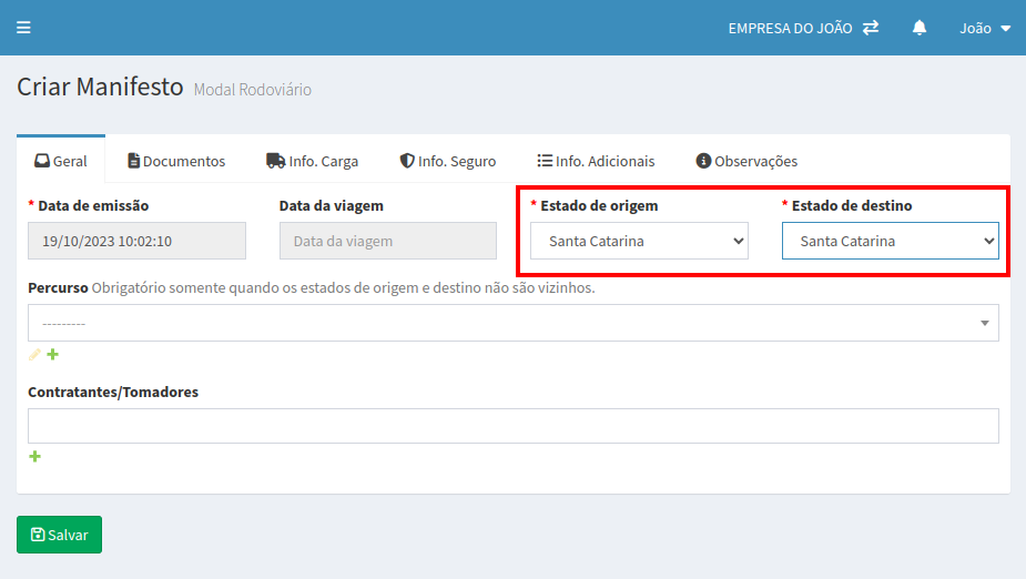 Na tela que abrir preencha os campos destacados abaixo, lembrando que Estado de Origem e Estado de Destino deverão ser iguais. A imagem abaixo mostra um exemplo de um transporte em Santa Catarina.