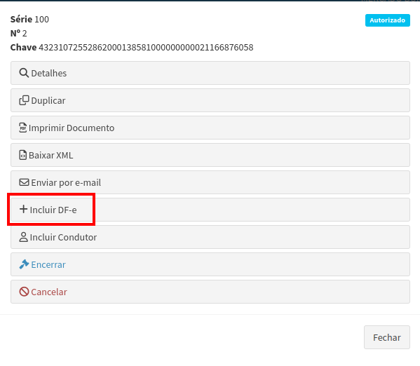Quando for fazer um carregamento, ou seja, incluir um documento nesse MDFe, clique em Ações e clique na opção Incluir DF-e.