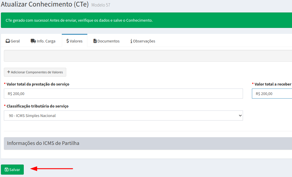 Passo 7: Depois de preencher as informações restantes, basta agora Salvar o CTe para posteriormente enviar para a SEFAZ para autorizar.