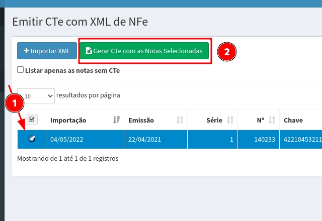 Para usar a nota, basta selecionar ela, clicando em cima da linha da NFe ou na caixinha, no início da linha, conforme aponta a imagem abaixo e em seguida clicar no botão Gerar CTe com as Notas Selecionadas.