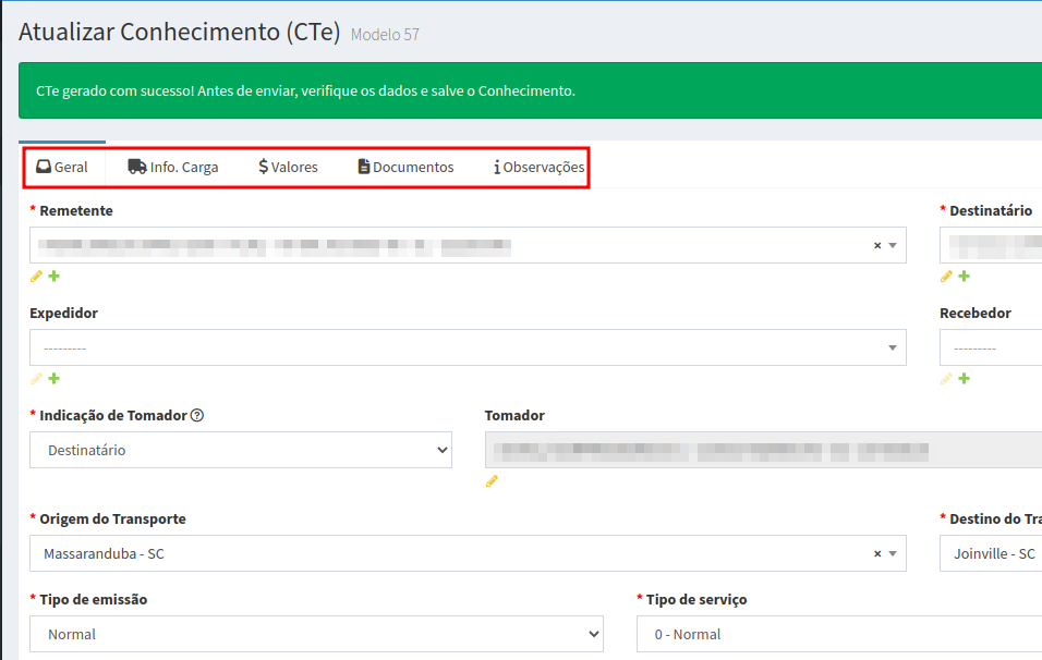 Passo 6: Depois de clicar para Emitir, o sistema vai abrir a tela do CTe com quase todos os dados já preenchidos com as informações contidas na NFe. Então você pode navegar entre as abas do CTe e conferir os dados e também preencher o restante dos dados que faltam, por exemplo valor e CFOP (que aliás pode ser configurado para ser automático, veja neste artigo). Veja na imagem abaixo as abas de informações do CTe.