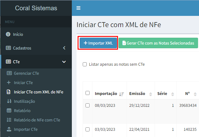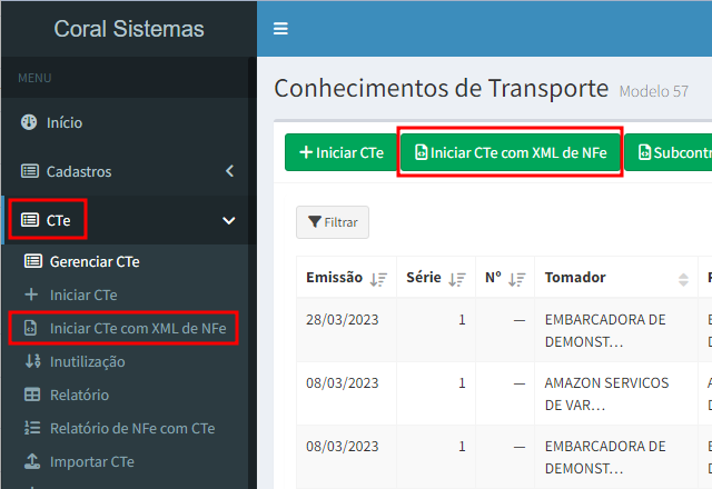 Passo 1: No menu lateral, você deve clicar em CTe e então em Iniciar CTe com XML de NFe, ou se tiver na tela de Gerenciamento de CTe, pode acessar através do botão Iniciar CTe com XML de NFe. Conforme destacado na imagem abaixo.