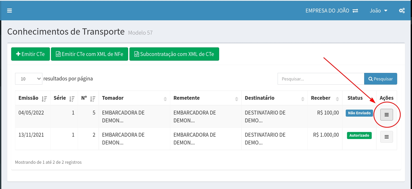 Passo 8: Depois de salvo, o CTe vai estar aparecendo em uma lista de CTe e nessa lista vai ter um botão de Ações para Enviar para a SEFAZ. Conforme apontado na imagem abaixo.