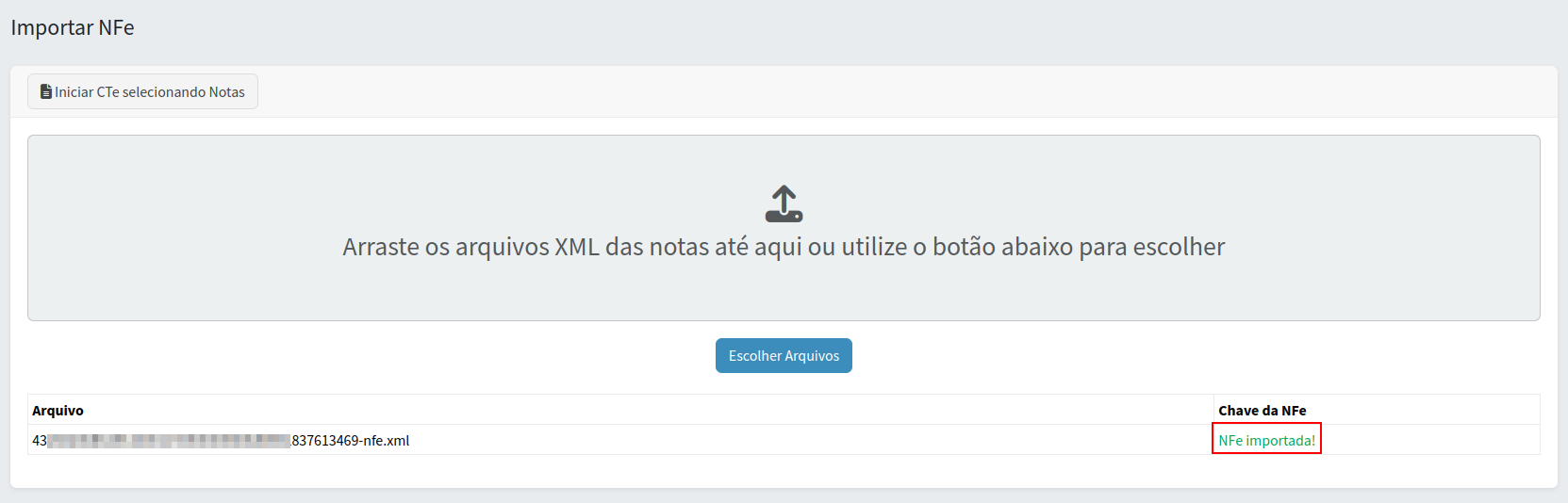 Se os arquivos XML forem importados com sucesso, será exibida uma mensagem informando que a NFe foi importada corretamente.