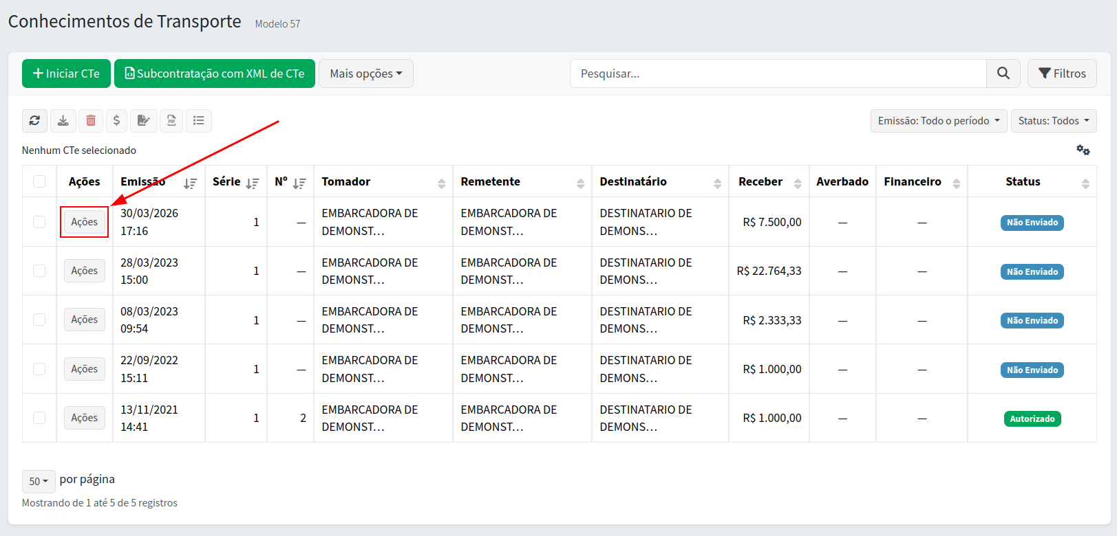 Após salvar, o CTe será exibido na lista de documentos.