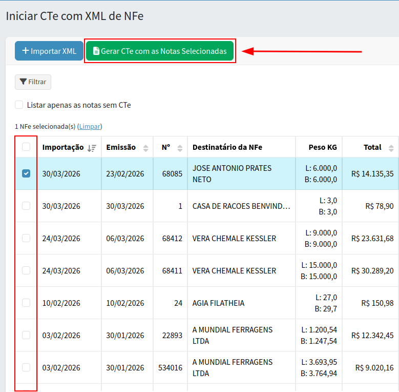 Em seguida, clique no botão "Gerar CTe com as notas selecionadas".