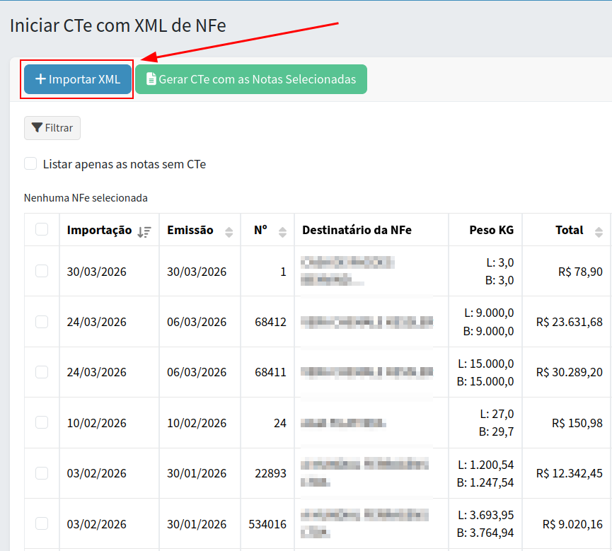 Todas as NFe importadas estarão disponíveis em uma lista para seleção.