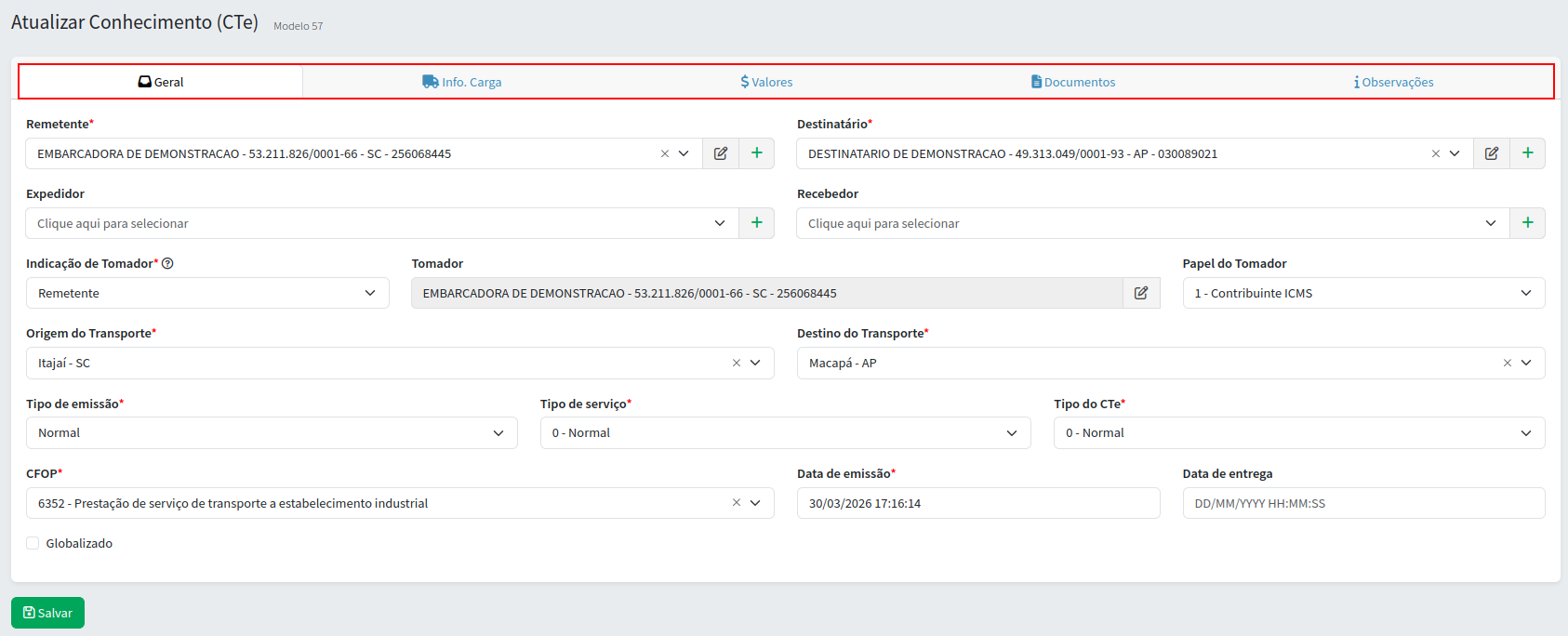 Após preencher as informações restantes, clique em "Salvar” para registrar o CTe e, posteriormente, enviá-lo para a SEFAZ para autorização.