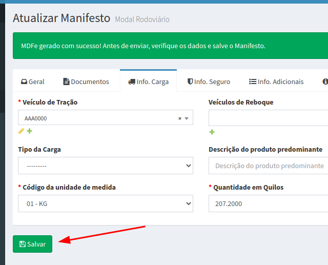 Passo 7: Depois de preencher as informações restantes, basta agora Salvar o MDFe para posteriormente enviar para a SEFAZ para autorizar.