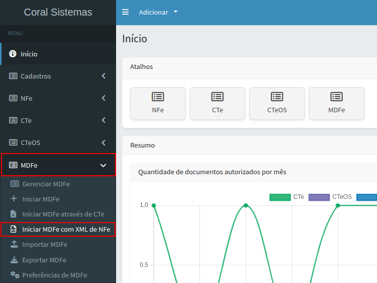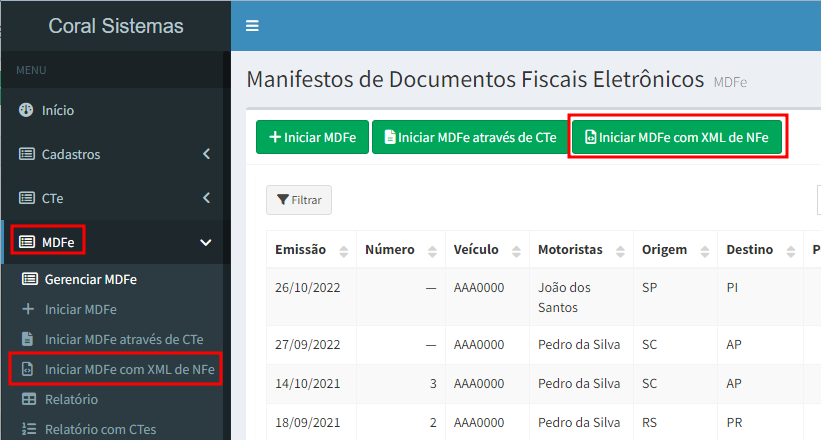 Passo 1: No menu lateral, você deve clicar em MDFe e então em Iniciar MDFe com XML de NFe, ou se tiver na tela de Gerenciamento de MDFe, pode acessar através do botão Iniciar MDFe com XML de NFe. Conforme destacado na imagem abaixo.