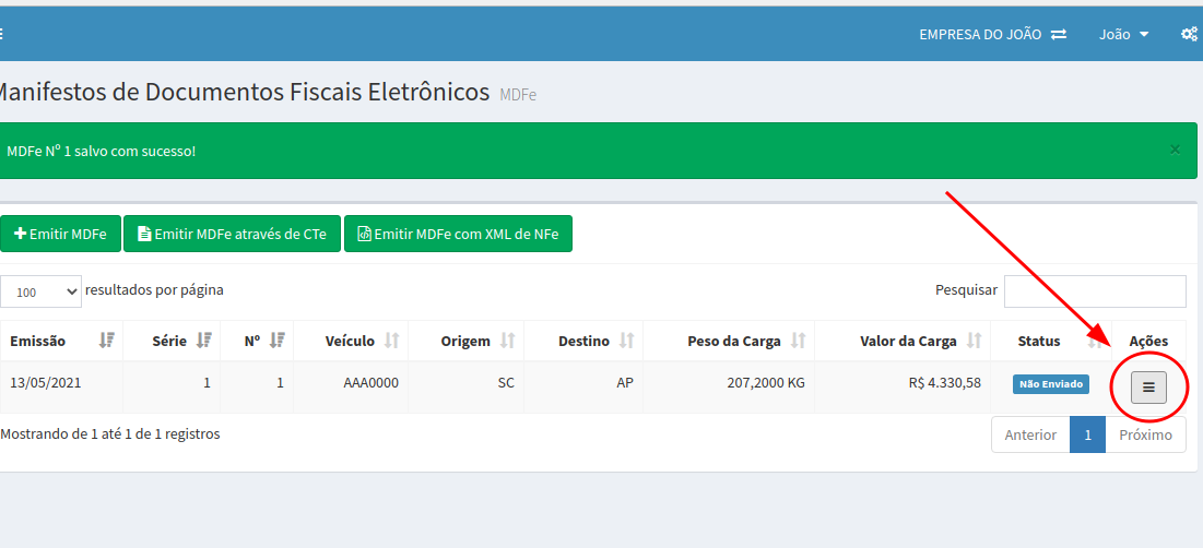 Passo 8: Depois de salvo, o MDFe vai estar aparecendo em uma lista de MDFe e nessa lista vai ter um botão de Ações para Enviar para a SEFAZ. Conforme apontado na imagem abaixo.
