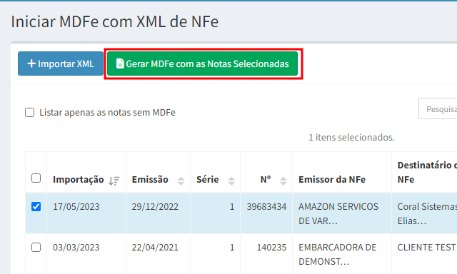 Para usar a nota, basta selecionar ela, clicando em cima da linha da NFe ou na caixinha, no inicio da linha, conforme aponta a imagem abaixo e em seguida clicar no botão Emitir MDFe com as Notas Selecionadas.