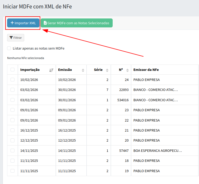 Depois de importado, pode clicar no botão Emitir MDFe selecionando Notas, conforme mostra imagem abaixo.