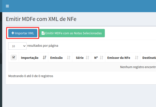 Para importar uma NFe, clique no botão Importar XML, conforme destacado na imagem abaixo.