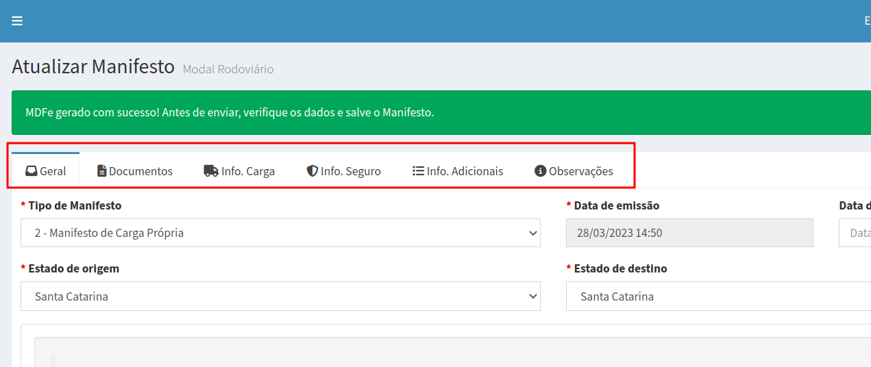 Passo 6: Depois de clicar para Emitir, o sistema vai abrir a tela do MDFe com quase todos os dados já preenchidos com as informações contidas na NFe. Então você pode navegar entre as abas do MDFe e conferir os dados e também preencher o restante dos dados que faltam, por exemplo veiculo e motorista. Veja na imagem abaixo as abas de informações do MDFe.