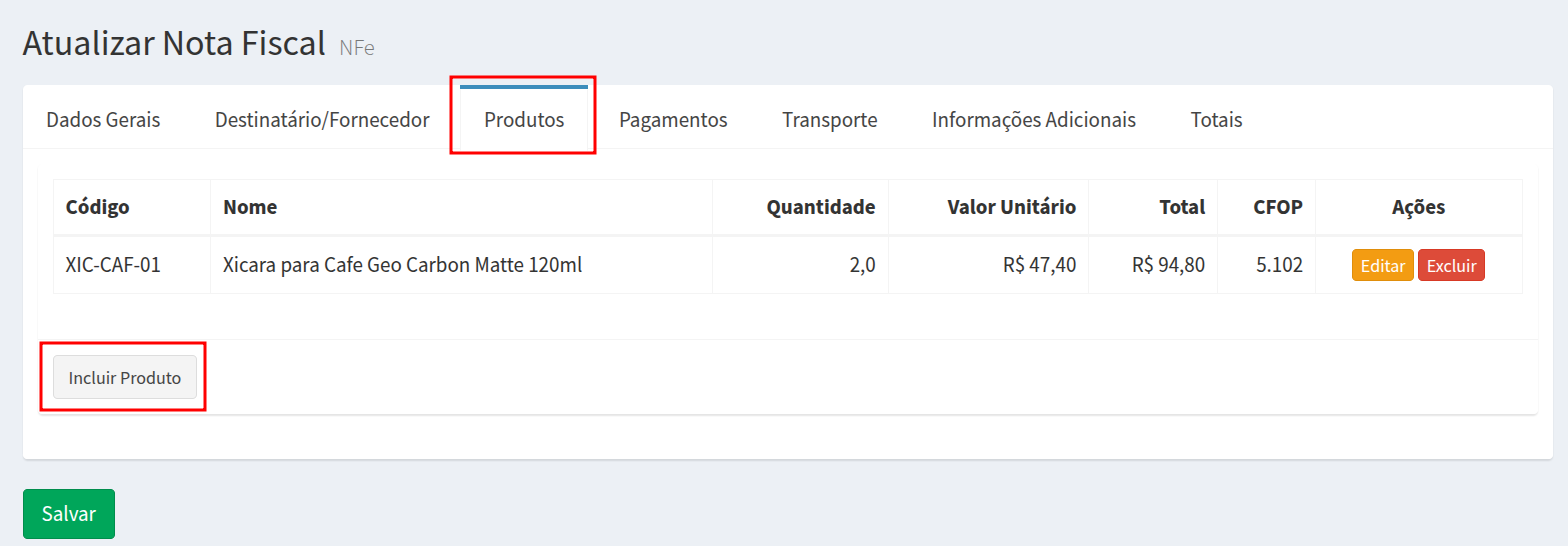 Depois de cadastrar o produto e incluí-lo na NFe, você poderá editar as informações como imposto, CFOP, quantidade ou excluir o produto da NFe.