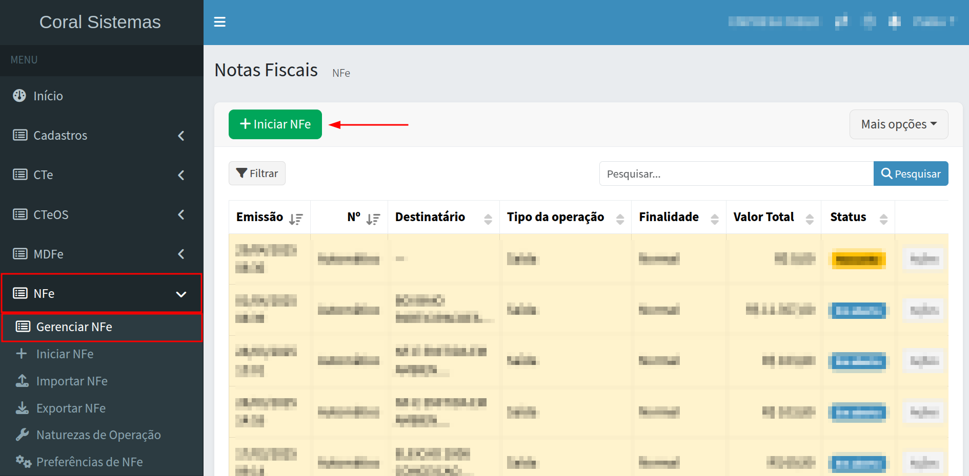 Para iniciar a NFe, no menu lateral clique em +Iniciar NFe ou no botão verde +Iniciar NFe.