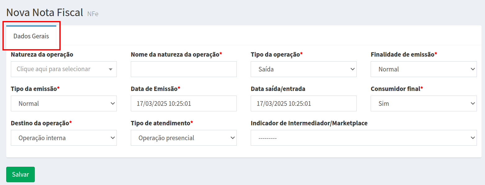 A interface Dados Gerais exibe todas as informações da NFe que precisam ser preenchidas. Lembre-se de que nem todos os campos são obrigatórios. Os campos obrigatórios estão destacados com um asterisco vermelho.