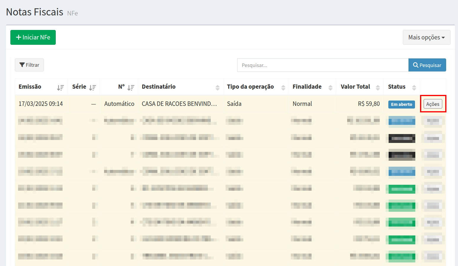 Após salvar a NFe, ela aparecerá em uma lista, como mostrado na imagem abaixo. Nesta lista, no lado direito, você encontrará o botão de Ações. Clique nele para fazer o envio da NFe para SEFAZ.