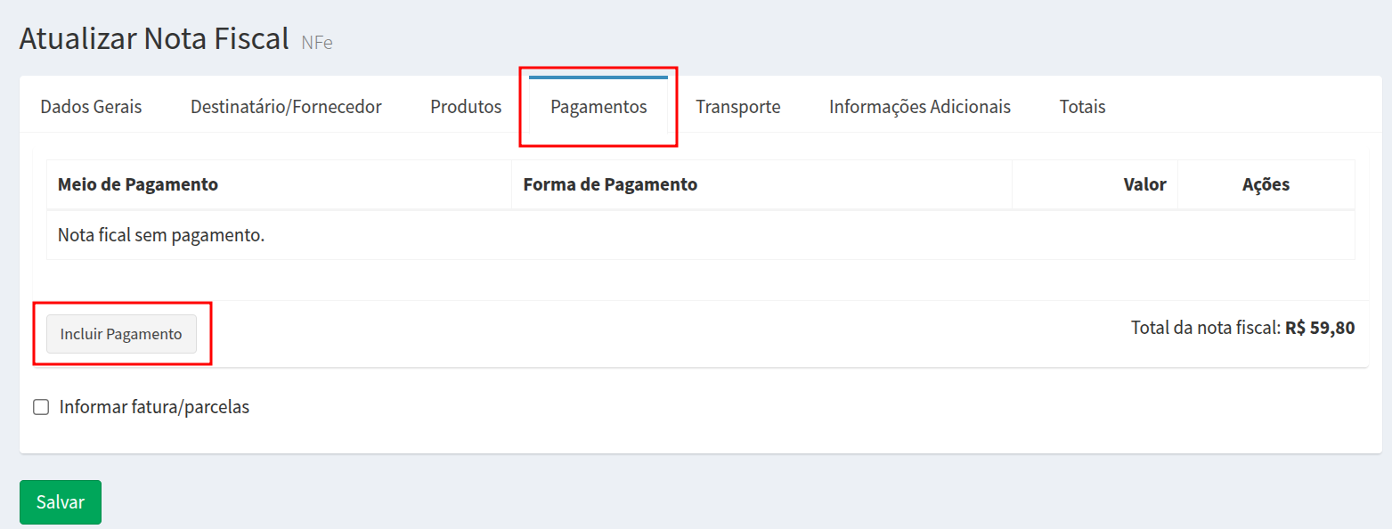 Para especificar o tipo de pagamento, clique no botão cinza Incluir Pagamento. Aparecerá uma interface para você selecionar o meio de pagamento (dinheiro, cartão de crédito, débito etc.), a forma de pagamento, se foi pago (à vista ou à prazo) e o valor total pago na mercadoria.