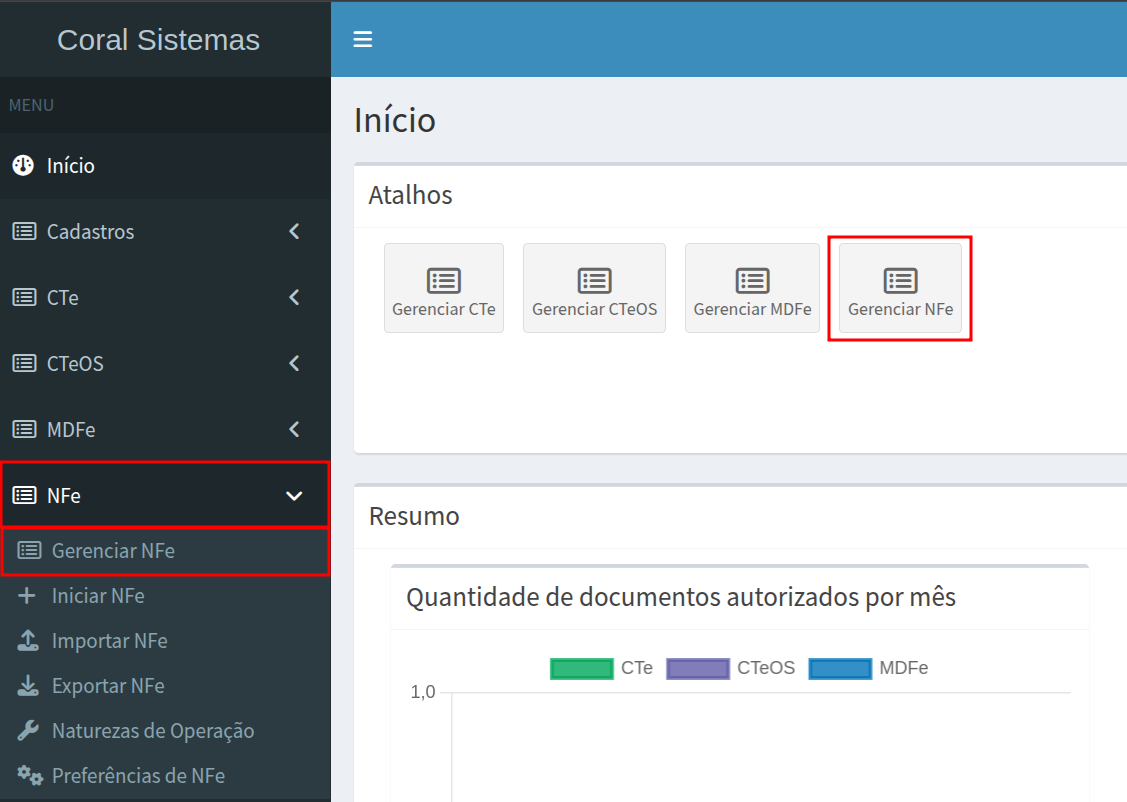 No menu lateral, clique em NFe e, em seguida Gerenciar NFe, ou diretamente no botão Gerenciar NFe em Atalhos, conforme mostra a imagem abaixo.