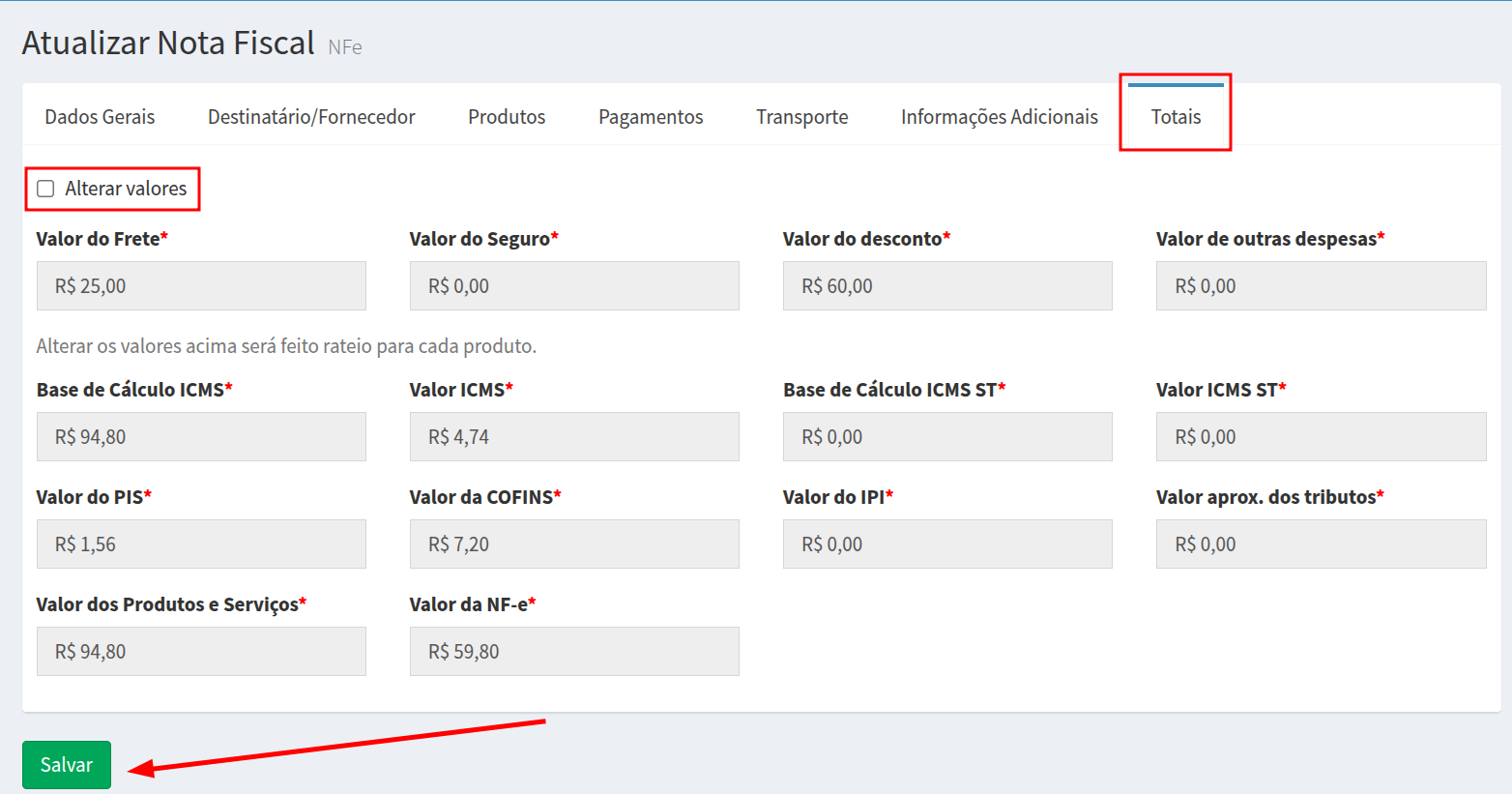 Os valores totais que aparecem são a soma dos itens/produtos informados na nota. Caso os totais não estejam de acordo, antes de alterar os totais verifique cada item informado na nota.
