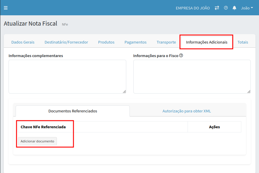 É nesta aba que irá informar a chave da NFe que será devolvida, além de outras informações adicionais, como observações, por exemplo.