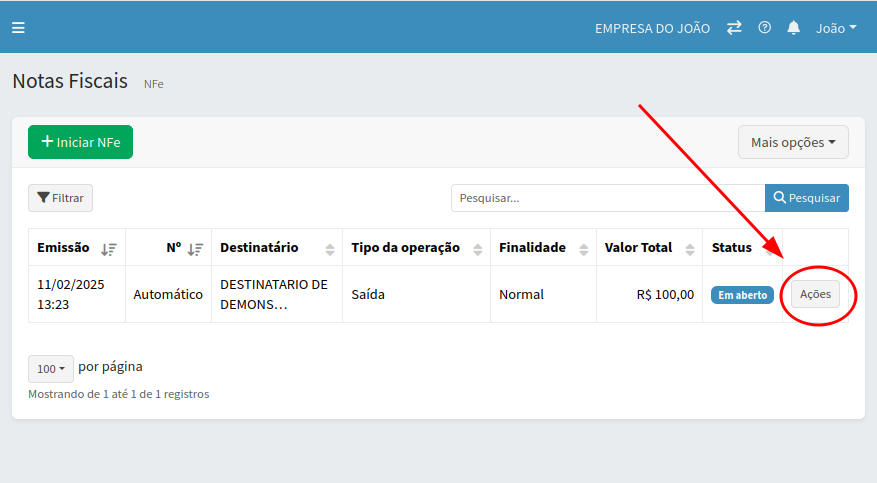 Após salvar a NFe, ela aparecerá em uma lista, como mostrado na imagem abaixo. Nesta lista, no lado direito, você encontrará o botão de Ações. Clique nele para fazer o envio da NFe para SEFAZ.
