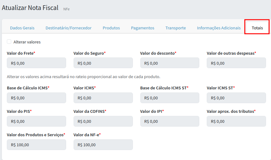 Esta interface exibe todas as informações totais dos valores dos produtos e impostos vinculados à mercadoria na NFe, que precisam ser preenchidas na aba de Produtos.