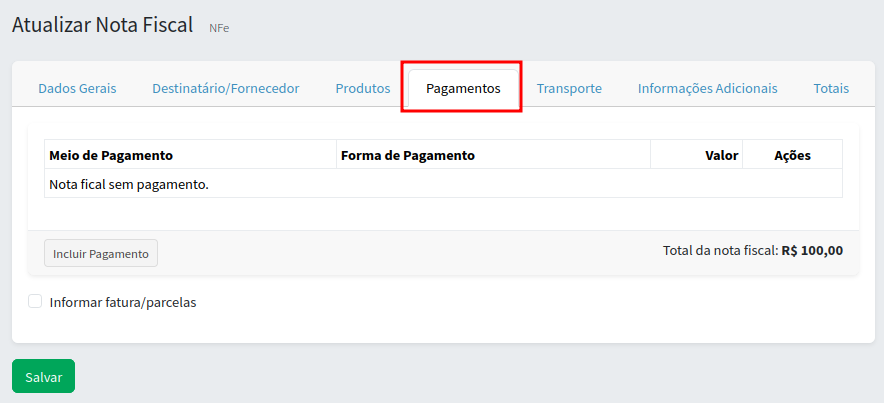 Se estiver tudo certo, o sistema vai salvar e então vai aparecer uma mensagem "NFe salva com sucesso!".