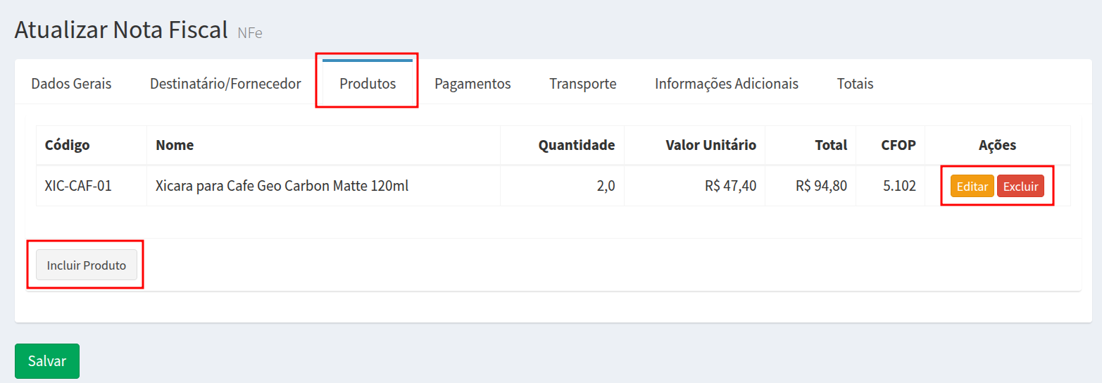 Depois de cadastrar o produto e incluí-lo na NFe, você poderá editar as informações como imposto, CFOP, quantidade ou excluir o produto da NFe.