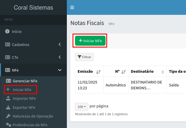 Nessa tela o sistema mostra as notas que tem lançadas no sistema. Para iniciar a NFe, clique no botão verde Iniciar NFe.