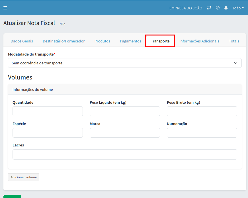 A aba de transporte também não é obrigatório o preenchimento. Esta interface exibe todas as informações relacionadas ao Transporte.