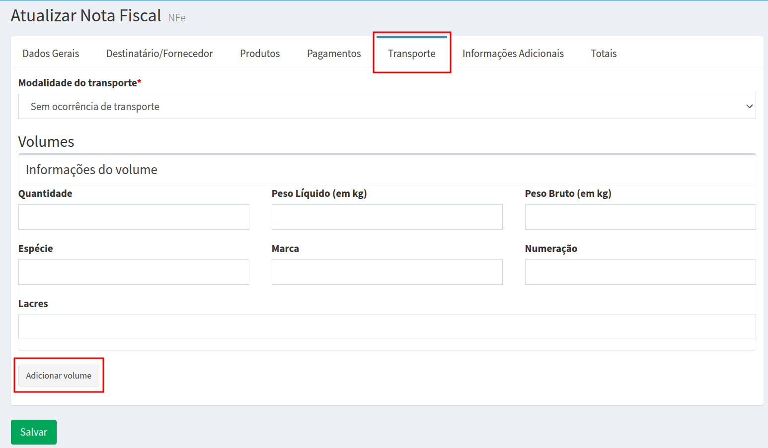 Abaixo deste campo, verá as informações dos volumes adicionados na NFe. Para adicionar mais volumes ao transporte, clique no botão cinza Adicionar volume e preencha as informações do novo volume.