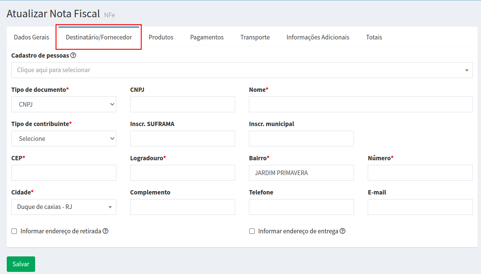 Esta interface apresenta todas as informações do Destinatário e Fornecedor que precisam ser preenchidas. Lembre-se de que nem todos os campos são obrigatórios. Os campos obrigatórios estão destacados com um asterisco vermelho.