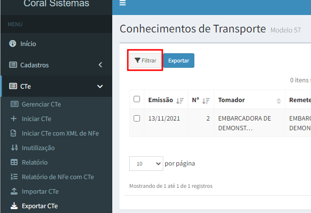 Na tela de Exportar XML, o sistema vai mostrar os CTes emitidos. Você pode usar a opção filtrar como mostrado abaixo na imagem e selecionar os CTes que deseja exportar.
