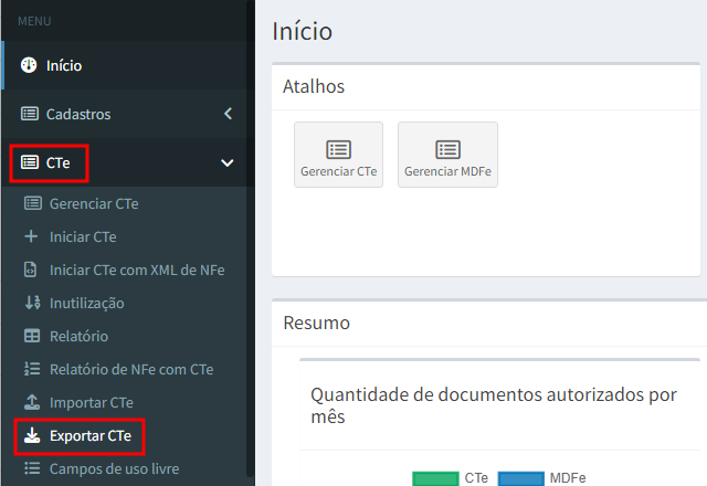 No menu lateral, clique na opção CTe e então na opção Exportar CTe