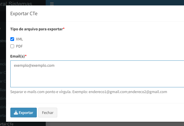Depois de clicar em Exportar o sistema vai mostrar uma tela onde você pode colocar o e-mail para qual será enviados os arquivos. Por padrão o e-mail do seu usuário já vem preenchido mas pode adicionar mais emails separando por ponto e virgula ( ; ). Também pode marcar se quer os arquivos do tipo XML ou PDF, ou ambos, marcando as duas opções. E por fim só clicar em Exportar, conforme mostra a imagem abaixo.