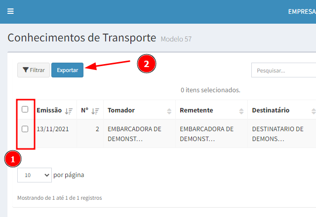 depois de filtrar os CTes desejados, próximo passo é selecionar os CTes que deseja exportar como mostrado no número (1) na imagem abaixo. Selecionando eles, você vai para o passo seguinte, como mostra no número (2), que basicamente é clicar em exportar.