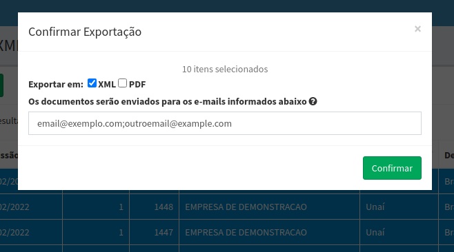 3. Depois de clicar em Exportar o sistema vai mostrar uma tela onde você pode colocar o e-mail para qual será enviados os arquivos. Por padrão o e-mail do seu usuário já vem preenchido mas pode adicionar mais emails separando por ponto e virgula ( ; ). Também pode marcar se quer os arquivos do tipo XML ou PDF, ou ambos, marcando as duas opções. E por fim só clicar em Confirmar, conforme mostra a imagem abaixo.