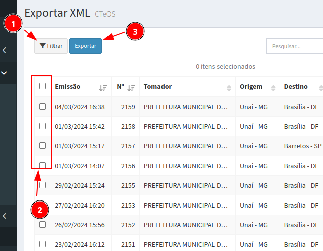 2. O segundo passo então é selecionar todos os CTeOS que queira exportar.