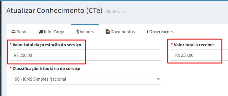 Outra informação que precisa alterar é o valor. Na aba Valores, você vai informar apenas o valor faltante. Então no nosso exemplo, onde o CTe era pra ser de 1250,00 e foi feito no valor de 1000,00, aqui no complemento vamos informar apenas os 250,00 faltantes, conforme mostra a imagem abaixo