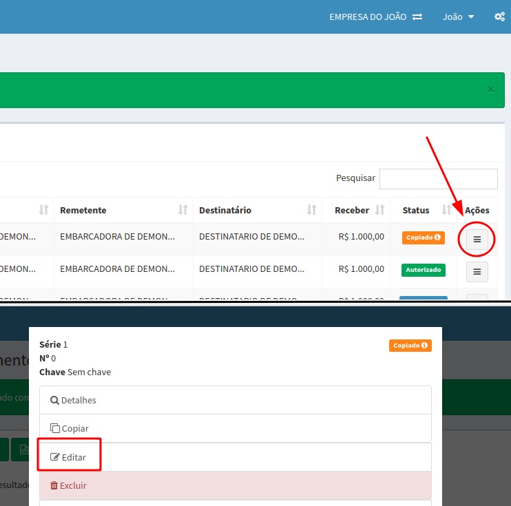 Após clicar em Duplicar, o sistema vai gerar uma cópia do CTe que precisa ser complementado. Agora você deve clicar em Ações, nesse CTe copiado, e clicar em Editar, conforme mostra imagem abaixo.