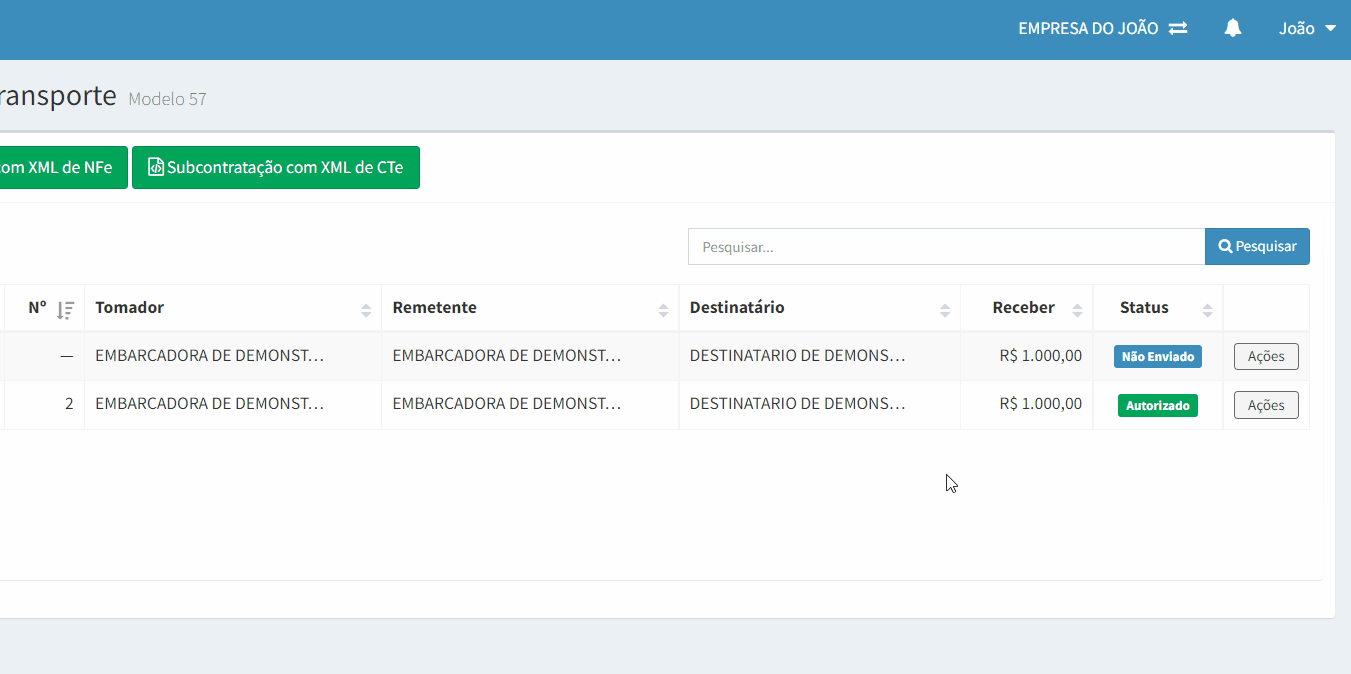 Para isso, clique em Ações, no CTe que quer complementar, e clique na opção Duplicar, conforme mostra imagem abaixo.
