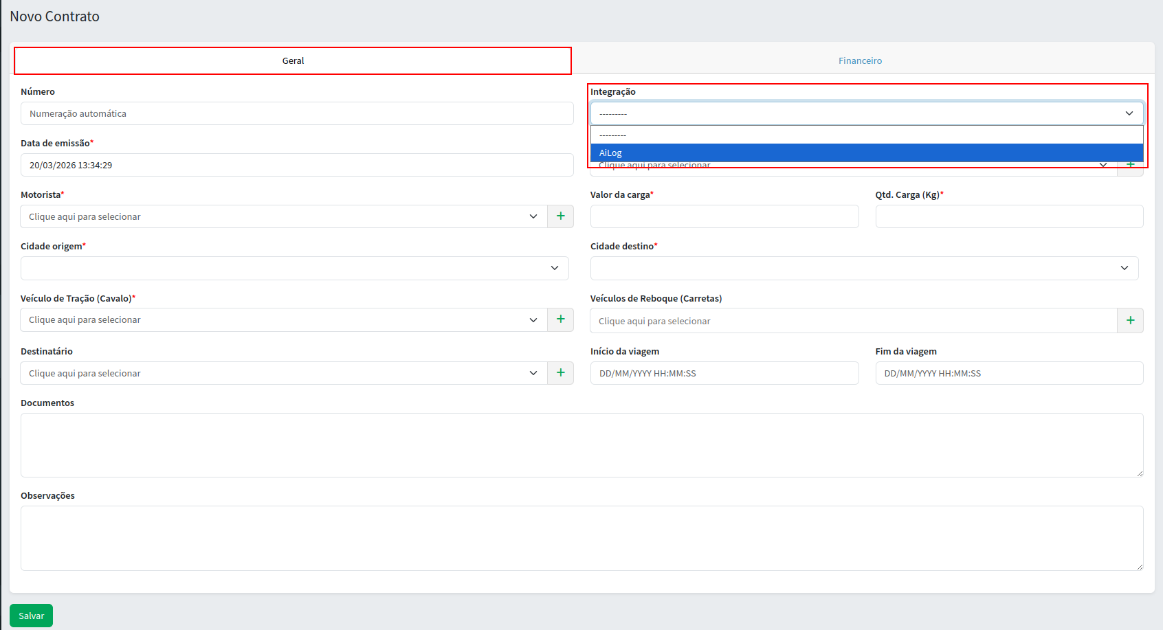 Em seguida, será mostrado os campos que precisa preencher de acordo com a operação e o campo para informar a Integração.
